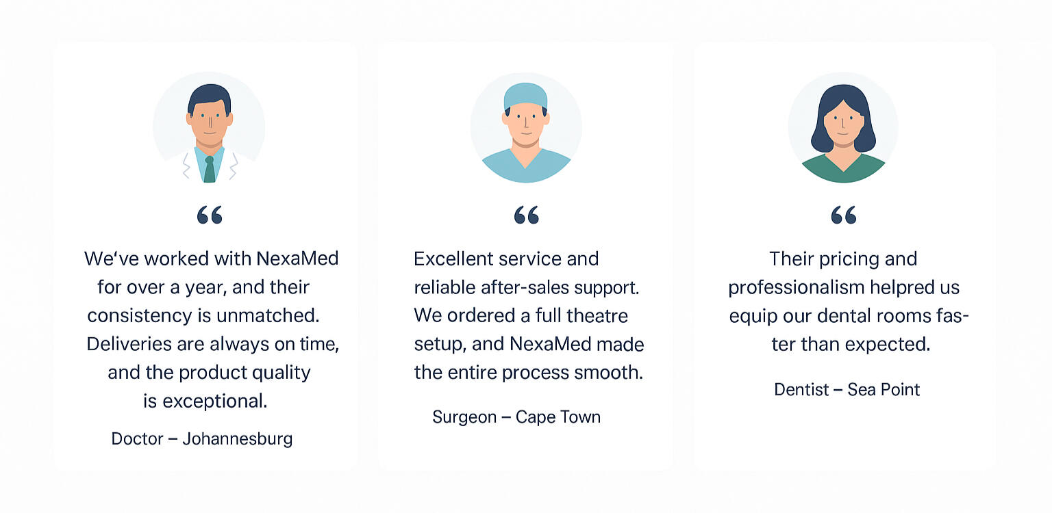 At NexaMed, we understand that healthcare facilities depend on reliable partners. That’s why hospitals, clinics, and private practitioners across South Africa choose us for our commitment to quality, speed, expertise, and value.